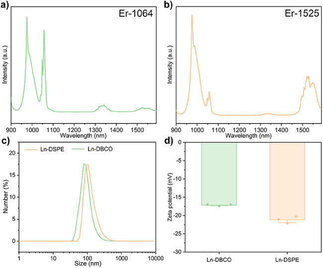 图2. Er-1064和Er-1525的NIR-II发光光谱,以及表面修饰后的纳米颗粒的粒径和zeta电位分析,表明其适合用于生物体内实验