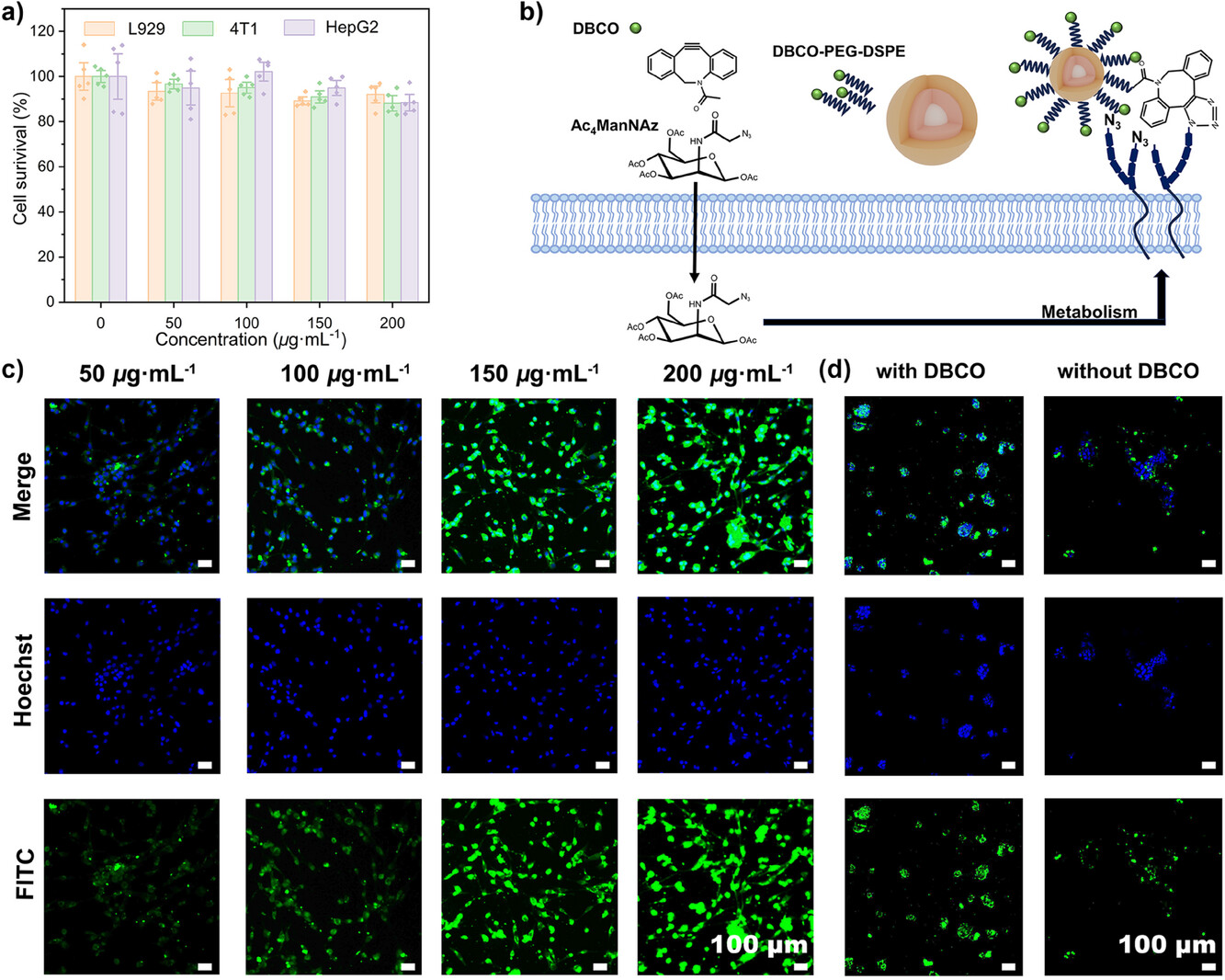 图2.通过细胞实验验证了Ln-DBCO的生物相容性和细胞摄取能力。结果表明,Ln-DBCO具有良好的细胞摄取性能,且在高浓度下仍保持较高的细胞活性。