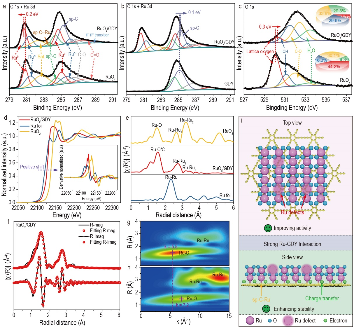 图2 电子结构表征。(a-c) RuOx/GDY、RuOx和GDY的C1s、Ru 3d和O1s XPS光谱;(d)RuOx/GDY、RuO2和Ru箔的XANES和(e)FT-EXAFS光谱(插图:XANES光谱的一阶导数);(f)RuOx/GDY的R空间FT-EXAFS拟合;(g)RuOx/GDY和(h)RuO2的WT-EXAFS光谱;(i)GDY与Ru强相互作用示意图。