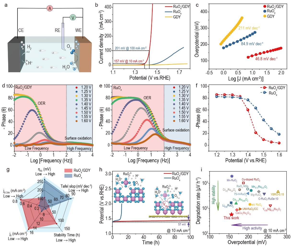 图3 OER在0.5 M H2SO4中的催化活性。(a)酸性溶液中电化学水分解三电极系统结构图;(b)RuOx/GDY、RuOx和GDY的OER的LSV曲线;(c)由(b)得出的塔菲尔斜率;(d-e) RuOx/GDY和RuOx的波德相图。(f)总结了RuOx/GDY和RuOx在1.20 V ~ 1.60 V电压范围内的相位角;(g)RuOx/GDY和RuOx的OER性能比较;(h)RuOx/GDY和RuOx在10 mA cm−2时的计时电位测定性能;(i)在10 mA cm−2下RuOx/GDY的过电位和降解速率与最近报道的Ru基氧化物催化剂的比较。