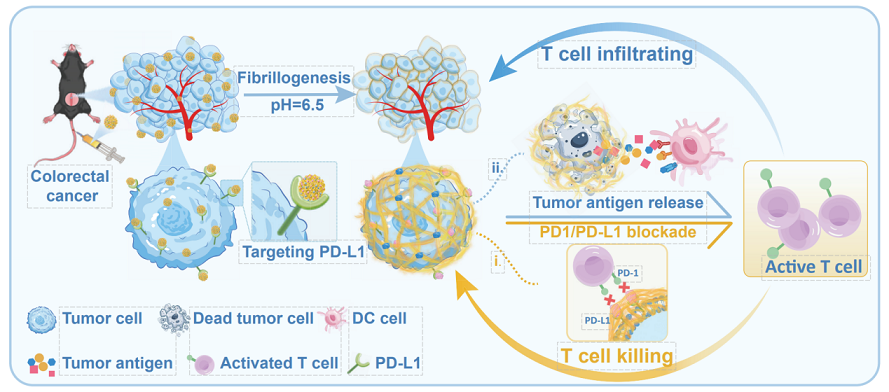 在肿瘤免疫治疗领域,免疫检查点抑制剂在错配修复功能完整(pMMR)的结直肠癌(CRC)等“免疫冷肿瘤”中疗效受限,其核心障碍在于其抑制性肿瘤微环境肿瘤相关抗原呈递和T细胞浸润的缺乏及免疫抑制性信号通路的活跃。为解决这一难题,国家纳米科学中心王浩研究员联合新桥医院等研究团队,开创性地研发了聚合物-多肽基智能形变材料。该体系能够响应肿瘤微环境(pH=6.5-6.8)特征,实现从纳米颗粒至纳米纤维的原位动态形貌转换,通过物理性破坏肿瘤细胞膜诱导免疫原性细胞死亡,从而高效逆转免疫抑制微环境,为结直肠癌的免疫治疗提供了全新的范式。相关成果以“Nanorobots Hold PD-L1 and Break Membrane of Colorectal Cancer Cells for Immunotherapy” 为题,发表于《自然-纳米技术》。