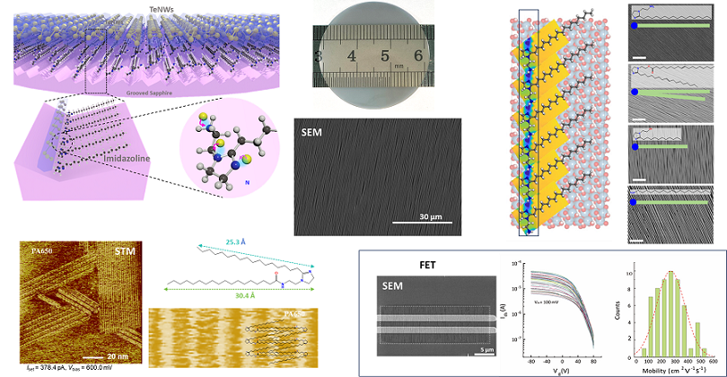 针对上述挑战,研究团队提出了一种基于“锚-绳”结构分子辅助成核的新策略。该方法选用m面取向的蓝宝石衬底,经高温退火形成具有平行排列的V型沟槽结构,随后在其表面修饰一类具有“锚-绳”结构的有机分子,如烷基咪唑啉、油胺等。这些分子一端为含咪唑基团、碳碳双键、氨基等基团的“锚”结构,对碲原子具有强亲和力;另一端为仅含碳碳单键的长链“绳”结构,对碲原子具有排斥作用。分子在V型沟槽中自组装后,形成周期性的碲原子吸附势场,引导碲原子优先吸附于沟槽底部并沿沟槽方向取向生长,最终形成高度有序的碲纳米线薄膜。
