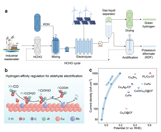 最近,赵慎龙课题组提出耦合阳极甲醛氧化的电解水制氢新策略,实现绿氢与高附加值化学品联产。相较传统水氧化阳极反应,该策略能够显著降低制氢能耗并提升阳极产物价值。针对传统Cu基催化剂醛氧化脱氢动力学缓慢的关键问题,提出基于理论计算指导的局部亲氢性调控工程,构筑了Rh1Cu单原子合金催化剂。该催化剂在甲醛电氧化生成甲酸与氢气反应中表现出高的法拉第效率(>99.3%),且具有超低过电位和超高电流密度(283 mV@500 mA cm−2),性能显著优于当前所报道的催化材料。构建的耦合电解系统在1000 mA cm−2电流密度下能够稳定运行超过1200 h,实现双极产氢与高附加值化学品二甲酸钾的联产,制氢能耗低至0.63 kWh Nm−3,展现出良好的工业应用潜力。