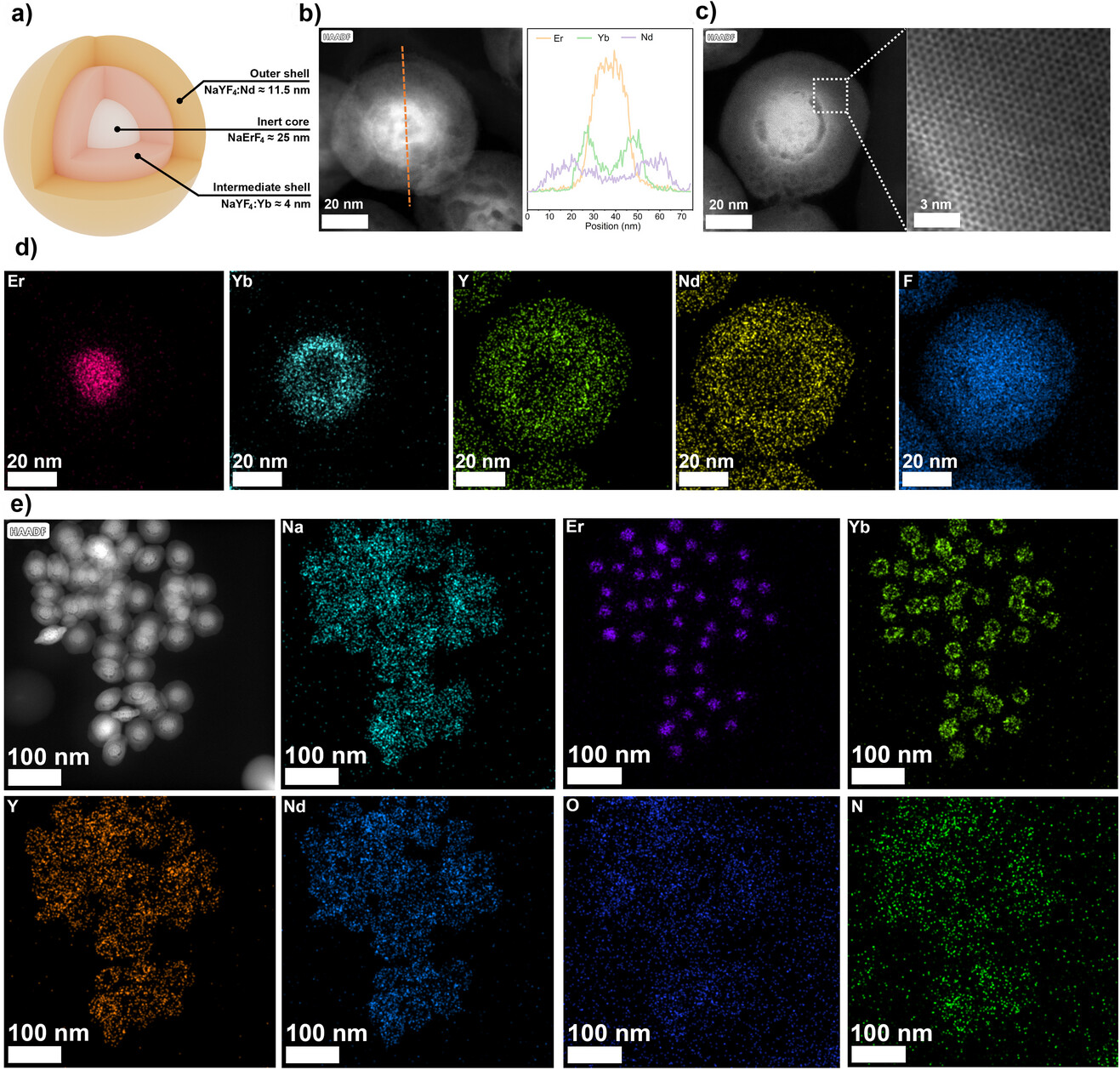 图1. 镧系纳米颗粒的透射电子显微镜(TEM)表征,包括其核心、中间层和外壳的结构。通过能量色散光谱(EDS)元素分布图,确认了各元素在各自层中的均匀分布。