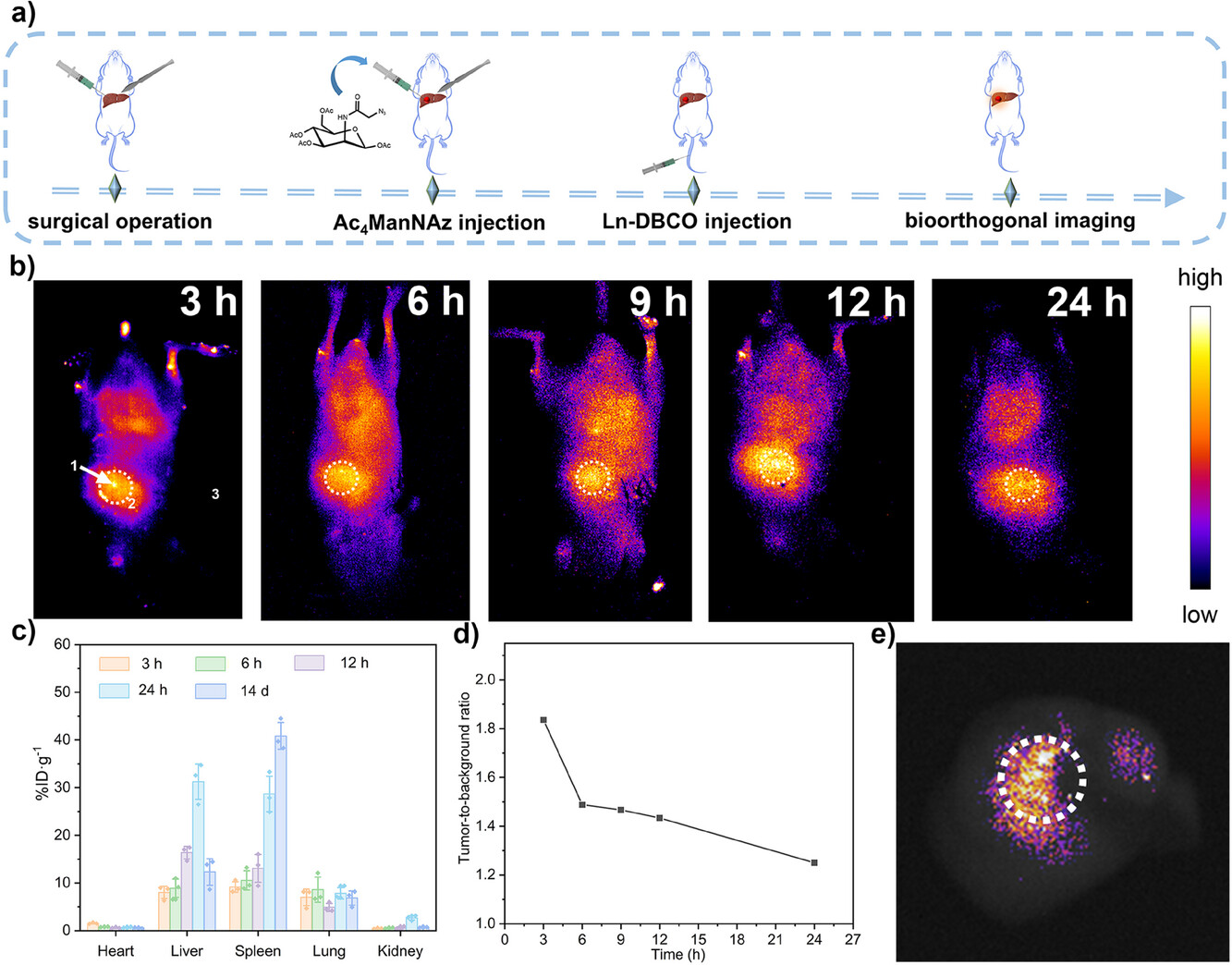 图4. 原位肝肿瘤模型的体内生物分布和NIR-II荧光成像结果。通过尾静脉注射Ln-DBCO,实现了对肿瘤部位的快速积累和清晰成像。