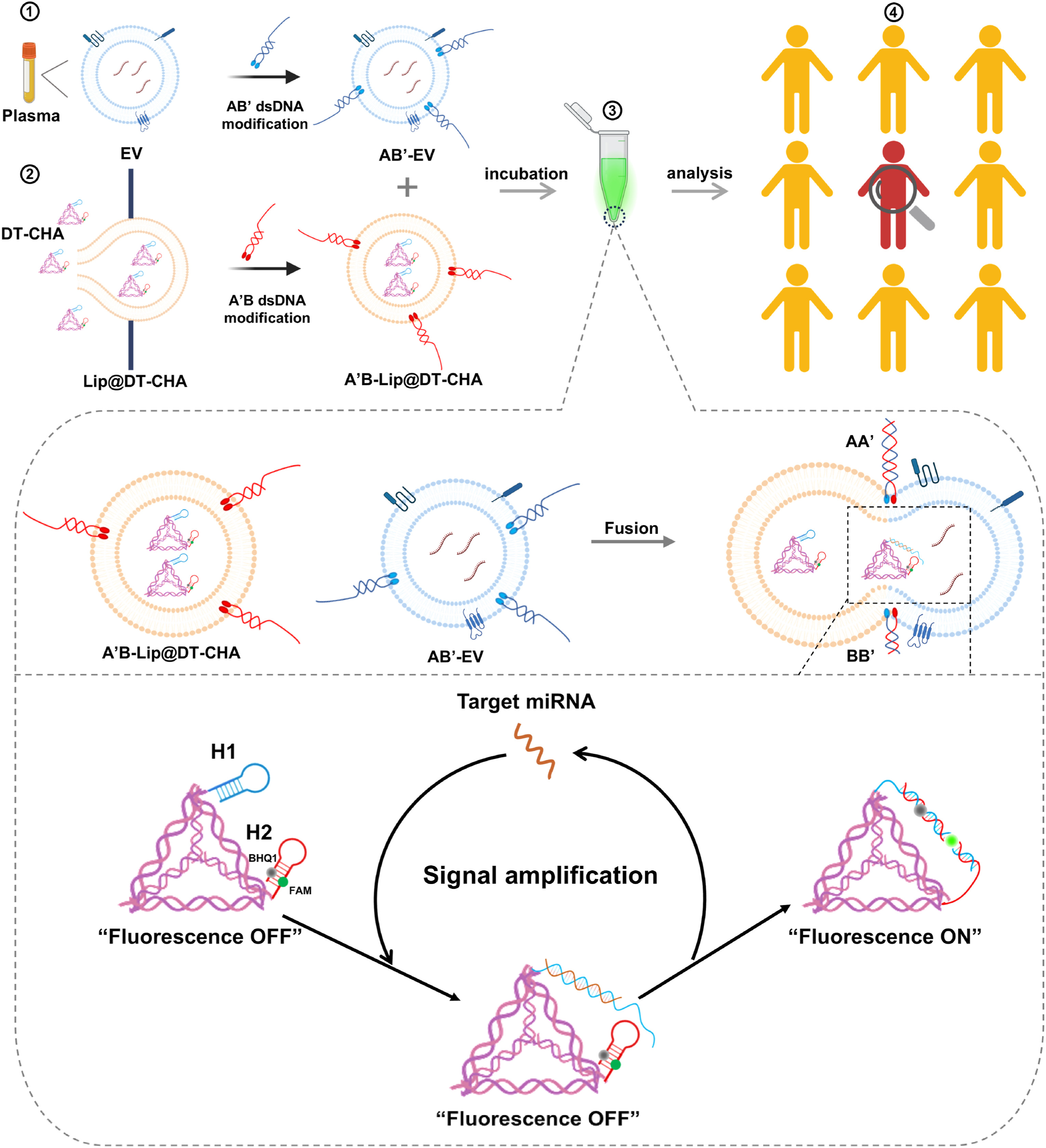 示意图:基于膜融合和DNA纳米结构的EV-miRNAs检测