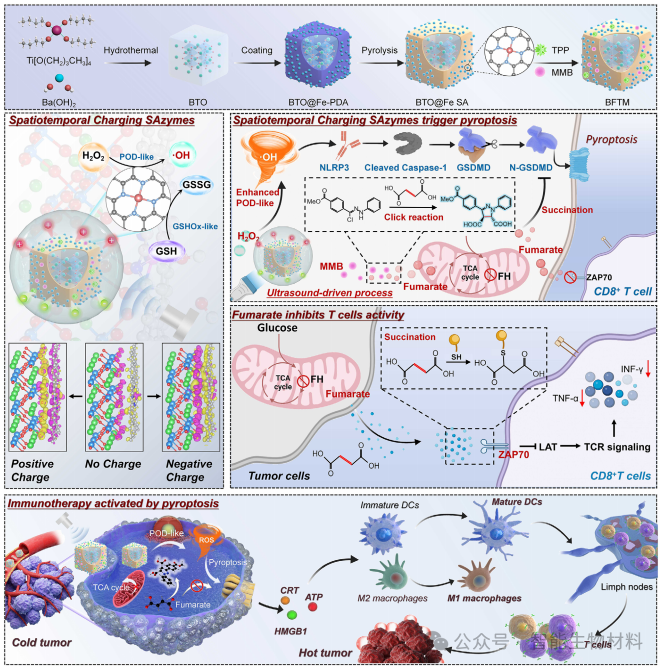 图1. 展示了BFTM的设计原理和作用机制。BFTM通过超声驱动的压电效应增强单原子铁位点的活性,产生活性氧(ROS),触发焦亡,并通过生物正交反应消耗琥珀酸,增强免疫治疗效果