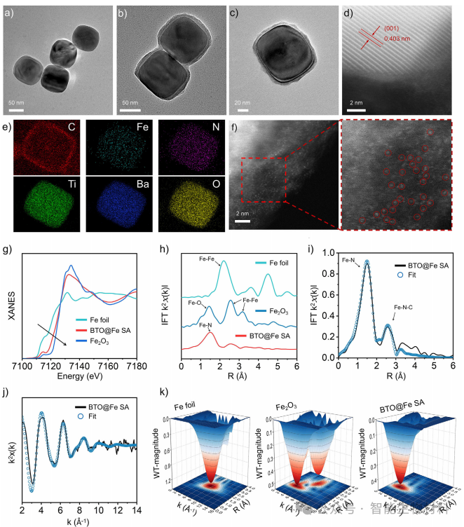 图2. 通过透射电子显微镜(TEM)和X射线吸收光谱(XAS)等技术,验证了BFTM的单原子结构和压电特性。实验结果表明,BFTM中的铁原子以单原子形式存在,并且压电效应显著增强了其催化活性