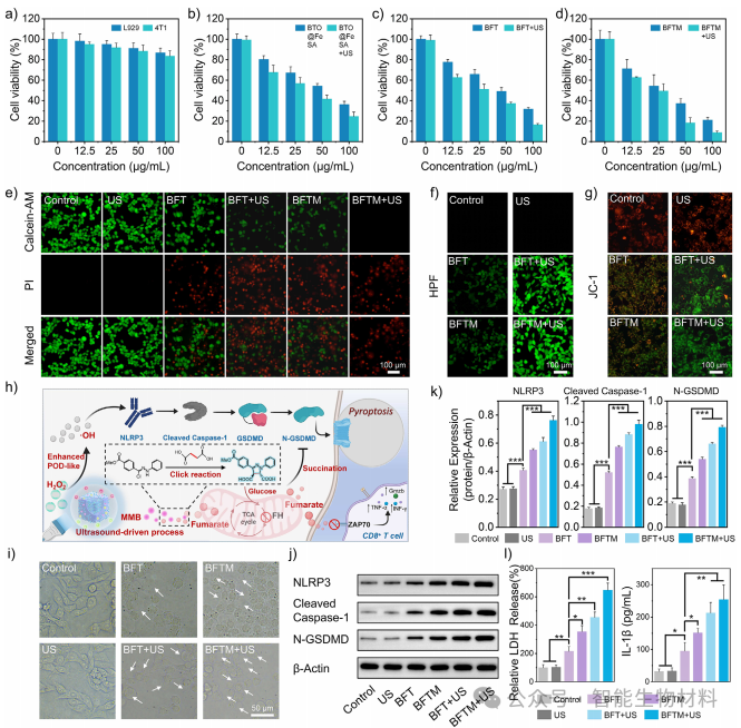 图3. 通过细胞实验,验证了BFTM在模拟肿瘤微环境条件下产生活性氧的能力及其对肿瘤细胞的杀伤效果。实验结果表明,超声驱动的BFTM能够显著增强ROS生成,诱导焦亡,并通过生物正交反应消耗琥珀酸,进一步增强焦亡效果