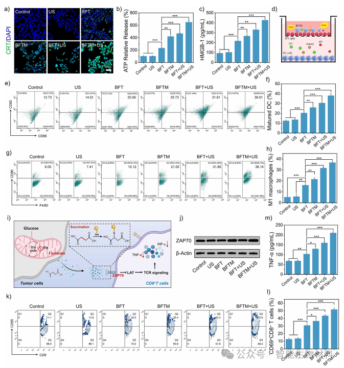 图5. 通过细胞实验,进一步验证了BFTM对肿瘤细胞焦亡的诱导作用及其对T细胞活性的恢复效果。实验结果表明,BFTM能够显著增强肿瘤细胞的免疫原性,激活树突状细胞(DCs),重塑免疫抑制的TME,并恢复T细胞的活性